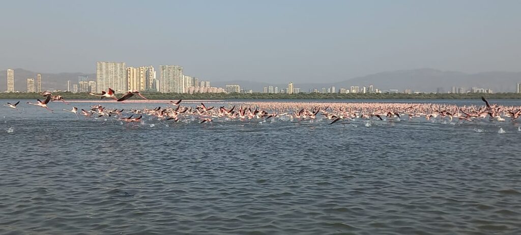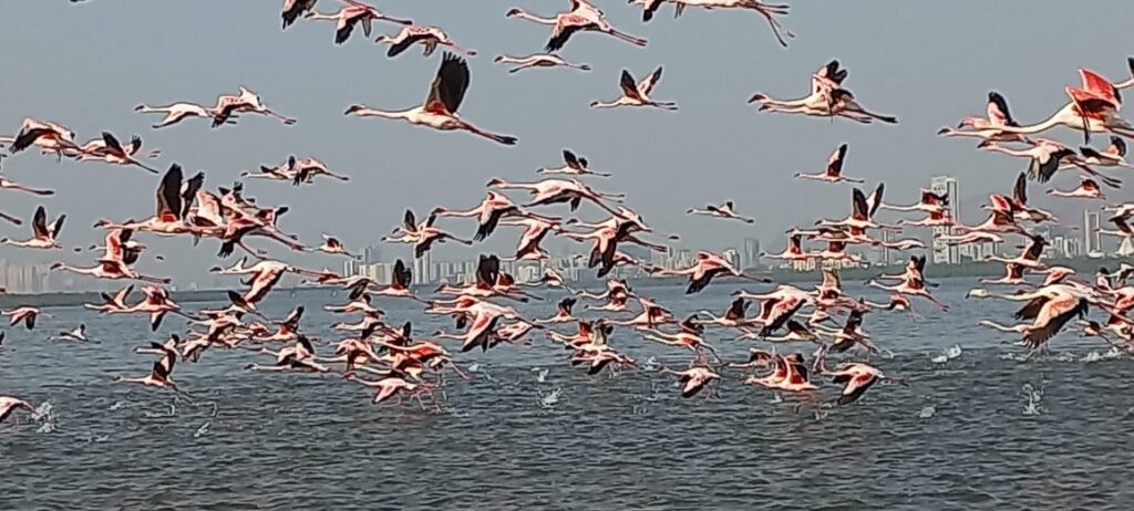 Flamingos are famous for their flame colour. They flew a long distance in search of food. Mangrove & creeks of Mumbai provide them food & shelter. For these few months, they lived here as a temporary home.